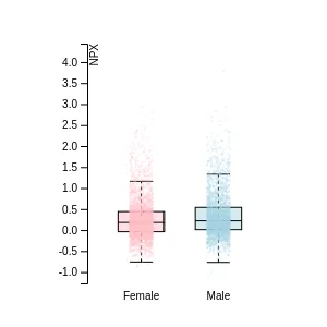 Blood protein levels in 96 healthy adults (aged 50–65) measured at six visits over a two-year period, shown separately for males and females. Relative protein abundances were quantified using the proximity extension assay (PEA) with the Olink Explore HT.
