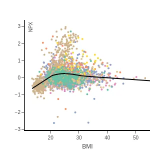 Blood protein levels by age, BMI, and sex, measured using the proximity extension assay (PEA) with the Olink Explore 1536. In the age and sex scatterplots, samples are colored by disease class.