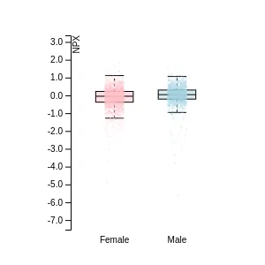 Blood protein levels in 96 healthy adults (aged 50–65) measured at six visits over a two-year period, shown separately for males and females. Relative protein abundances were quantified using the proximity extension assay (PEA) with the Olink Explore HT.