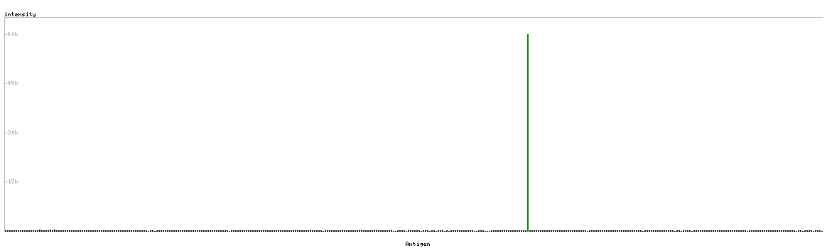 At the top of the view, the position of the antigen (identified by the corresponding HPA identifier) is shown as a green bar. A yellow triangle on the bar indicates a <100% sequence identity to the protein target.