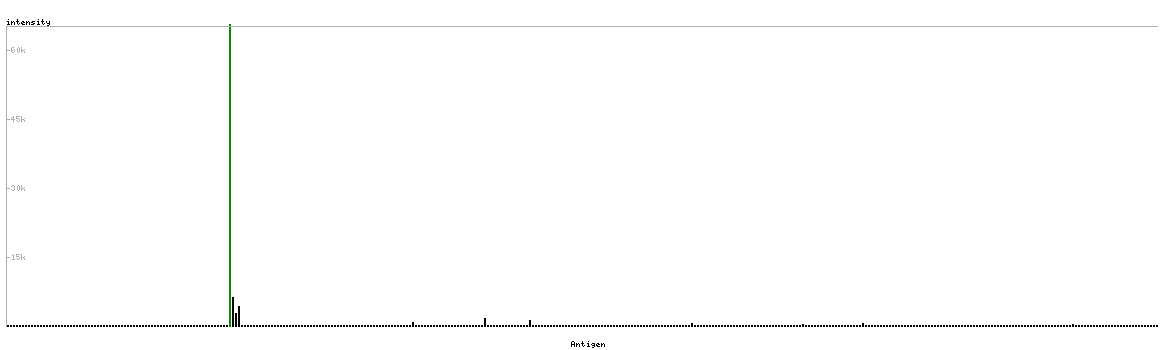 At the top of the view, the position of the antigen (identified by the corresponding HPA identifier) is shown as a green bar. A yellow triangle on the bar indicates a <100% sequence identity to the protein target.
