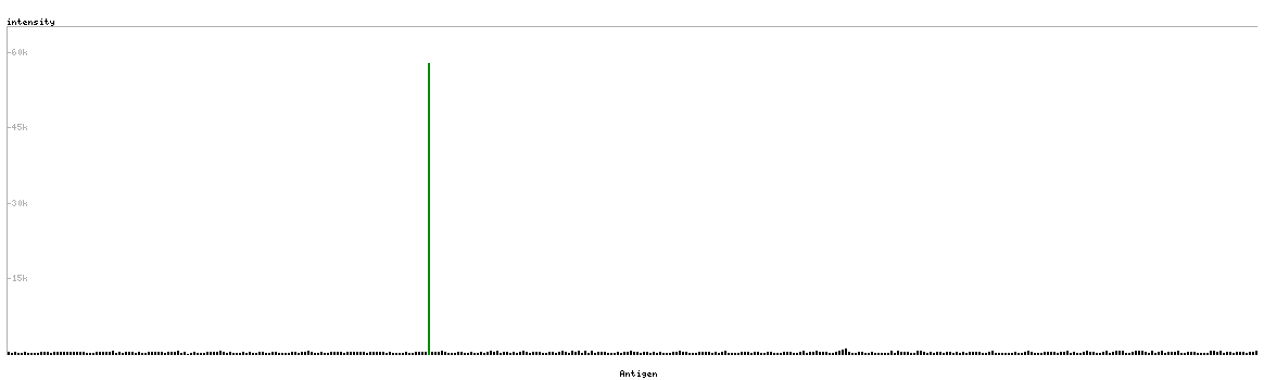 At the top of the view, the position of the antigen (identified by the corresponding HPA identifier) is shown as a green bar. A yellow triangle on the bar indicates a <100% sequence identity to the protein target.