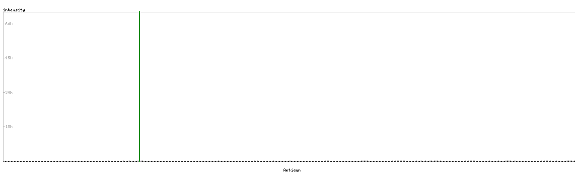 At the top of the view, the position of the antigen (identified by the corresponding HPA identifier) is shown as a green bar. A yellow triangle on the bar indicates a <100% sequence identity to the protein target.
