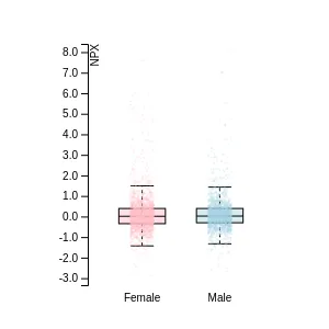 Blood protein levels in 96 healthy adults (aged 50–65) measured at six visits over a two-year period, shown separately for males and females. Relative protein abundances were quantified using the proximity extension assay (PEA) with the Olink Explore HT.