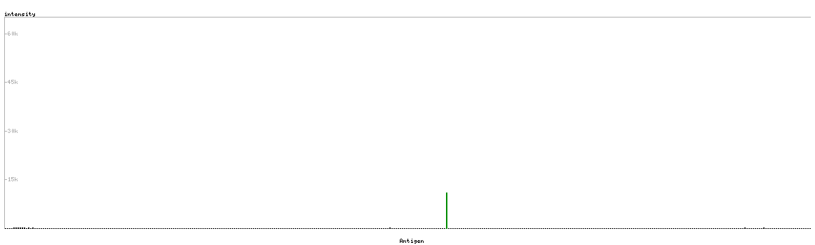 At the top of the view, the position of the antigen (identified by the corresponding HPA identifier) is shown as a green bar. A yellow triangle on the bar indicates a <100% sequence identity to the protein target.