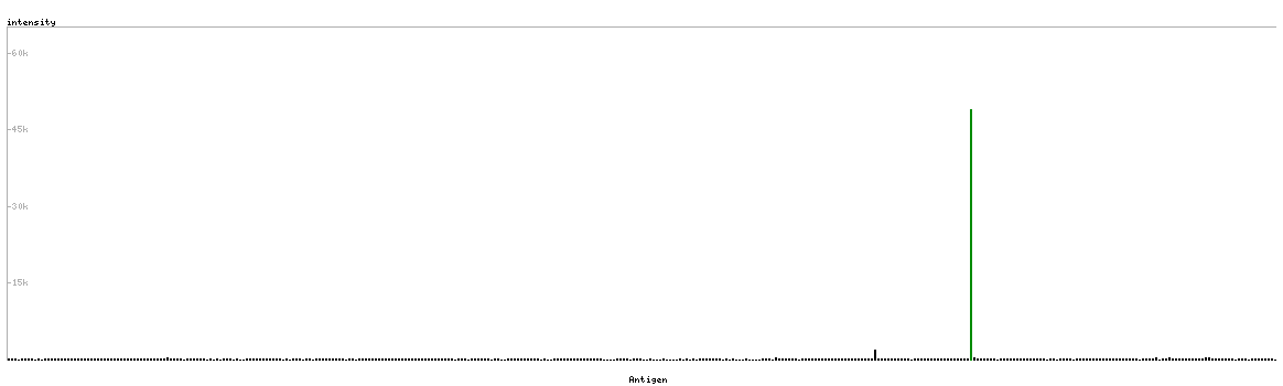 At the top of the view, the position of the antigen (identified by the corresponding HPA identifier) is shown as a green bar. A yellow triangle on the bar indicates a <100% sequence identity to the protein target.