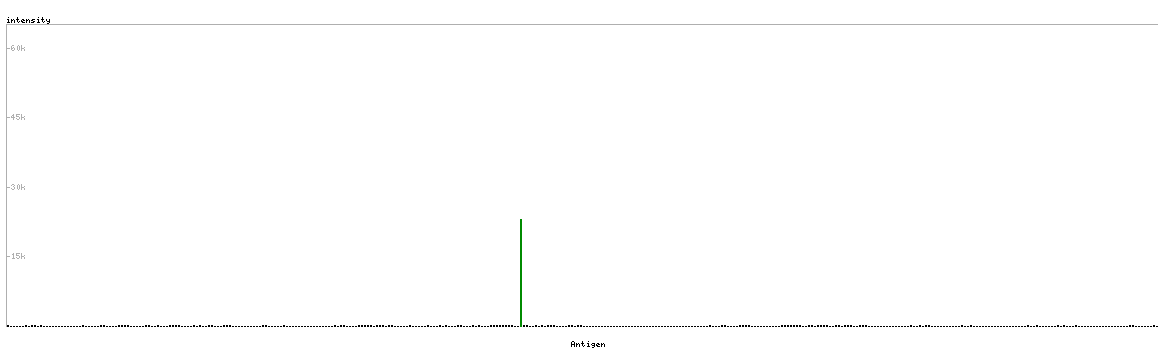 At the top of the view, the position of the antigen (identified by the corresponding HPA identifier) is shown as a green bar. A yellow triangle on the bar indicates a <100% sequence identity to the protein target.