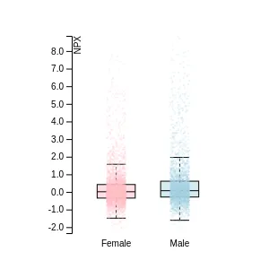 Blood protein levels in 96 healthy adults (aged 50–65) measured at six visits over a two-year period, shown separately for males and females. Relative protein abundances were quantified using the proximity extension assay (PEA) with the Olink Explore HT.