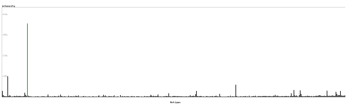 At the top of the view, the position of the antigen (identified by the corresponding HPA identifier) is shown as a green bar. A yellow triangle on the bar indicates a <100% sequence identity to the protein target.