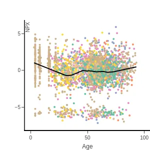Blood protein levels by age, BMI, and sex, measured using the proximity extension assay (PEA) with the Olink Explore 1536. In the age and sex scatterplots, samples are colored by disease class.