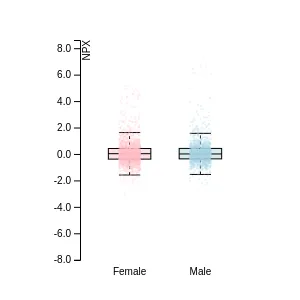 Blood protein levels in 96 healthy adults (aged 50–65) measured at six visits over a two-year period, shown separately for males and females. Relative protein abundances were quantified using the proximity extension assay (PEA) with the Olink Explore HT.