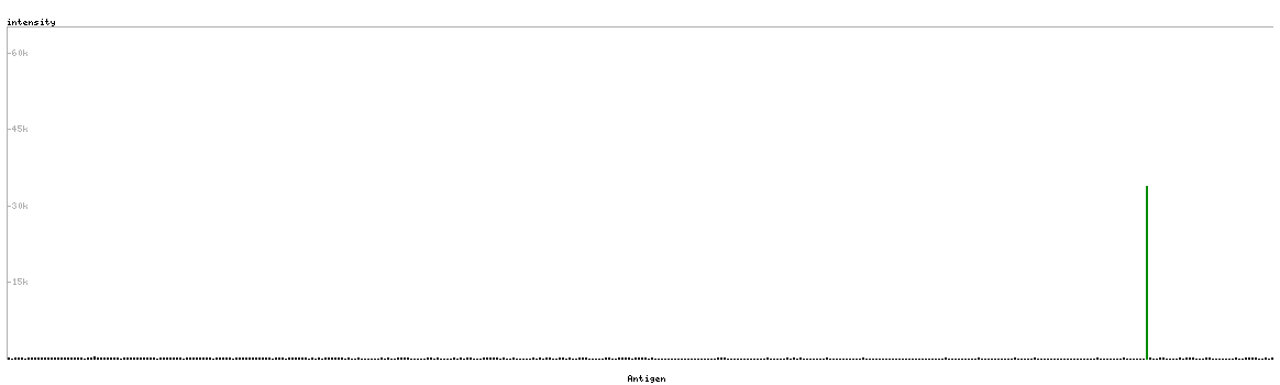 At the top of the view, the position of the antigen (identified by the corresponding HPA identifier) is shown as a green bar. A yellow triangle on the bar indicates a <100% sequence identity to the protein target.