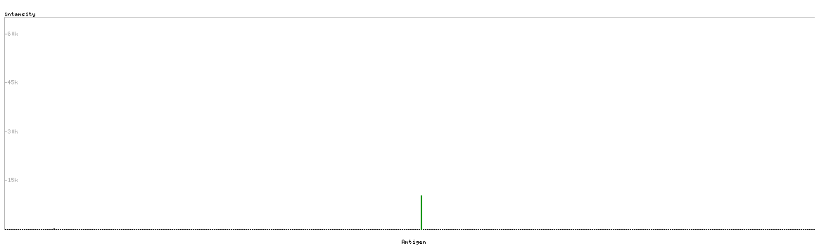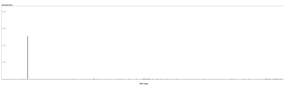 At the top of the view, the position of the antigen (identified by the corresponding HPA identifier) is shown as a green bar. A yellow triangle on the bar indicates a <100% sequence identity to the protein target.