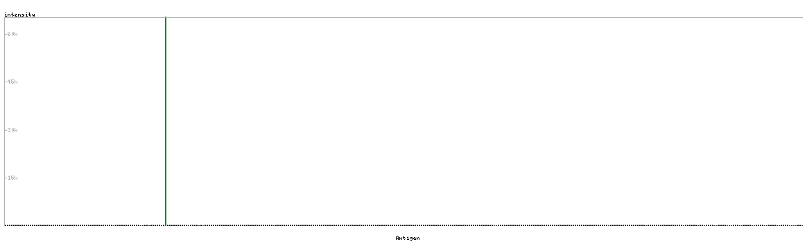 At the top of the view, the position of the antigen (identified by the corresponding HPA identifier) is shown as a green bar. A yellow triangle on the bar indicates a <100% sequence identity to the protein target.
