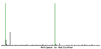 At the top of the view, the position of the antigen (identified by the corresponding HPA identifier) is shown as a green bar. A yellow triangle on the bar indicates a <100% sequence identity to the protein target.
