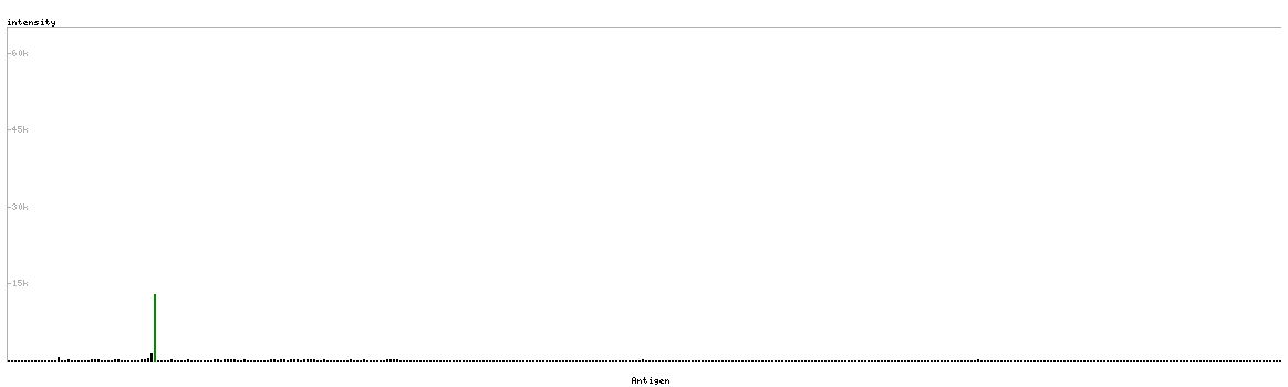 At the top of the view, the position of the antigen (identified by the corresponding HPA identifier) is shown as a green bar. A yellow triangle on the bar indicates a <100% sequence identity to the protein target.