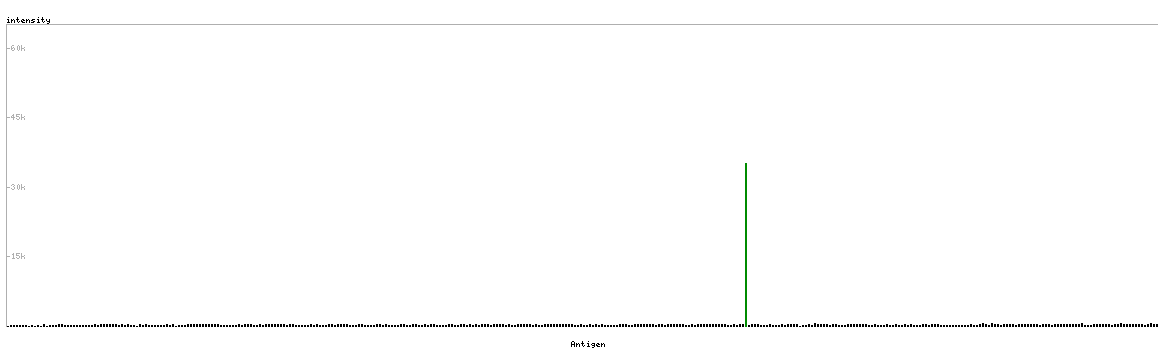 At the top of the view, the position of the antigen (identified by the corresponding HPA identifier) is shown as a green bar. A yellow triangle on the bar indicates a <100% sequence identity to the protein target.