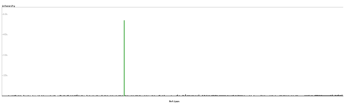 At the top of the view, the position of the antigen (identified by the corresponding HPA identifier) is shown as a green bar. A yellow triangle on the bar indicates a <100% sequence identity to the protein target.