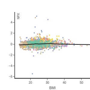 Blood protein levels by age, BMI, and sex, measured using the proximity extension assay (PEA) with the Olink Explore 1536. In the age and sex scatterplots, samples are colored by disease class.