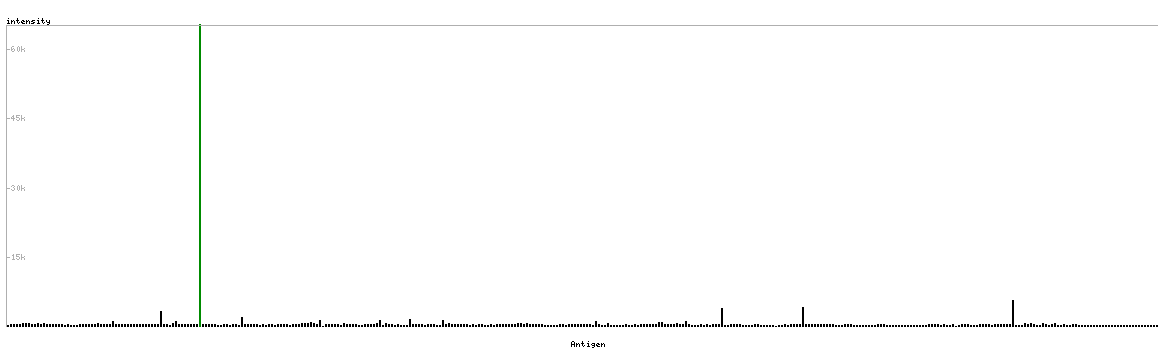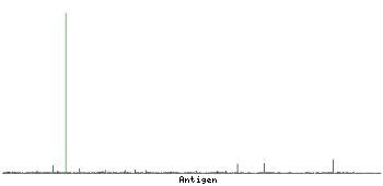 At the top of the view, the position of the antigen (identified by the corresponding HPA identifier) is shown as a green bar. A yellow triangle on the bar indicates a <100% sequence identity to the protein target.