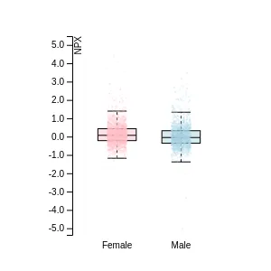 A gene is classified as upregulated in a disease if the average concentration of all samples of that disease is significantly higher (adj P-value<0.005 and NPX difference>=1) than the average concentration of samples of all diseases as measured by PEA . For gender specific diseases the analysis includes only samples corresponding to the same gender from the other diseases.