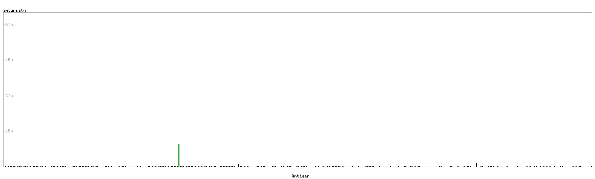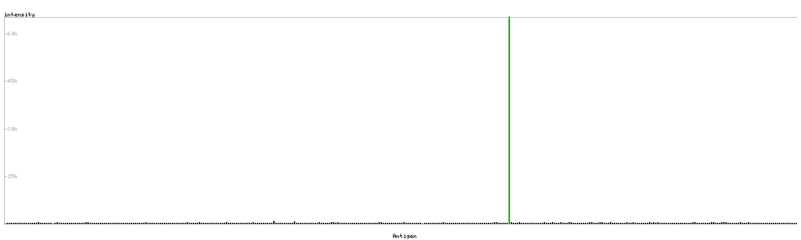 At the top of the view, the position of the antigen (identified by the corresponding HPA identifier) is shown as a green bar. A yellow triangle on the bar indicates a <100% sequence identity to the protein target.