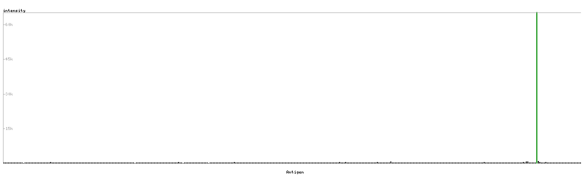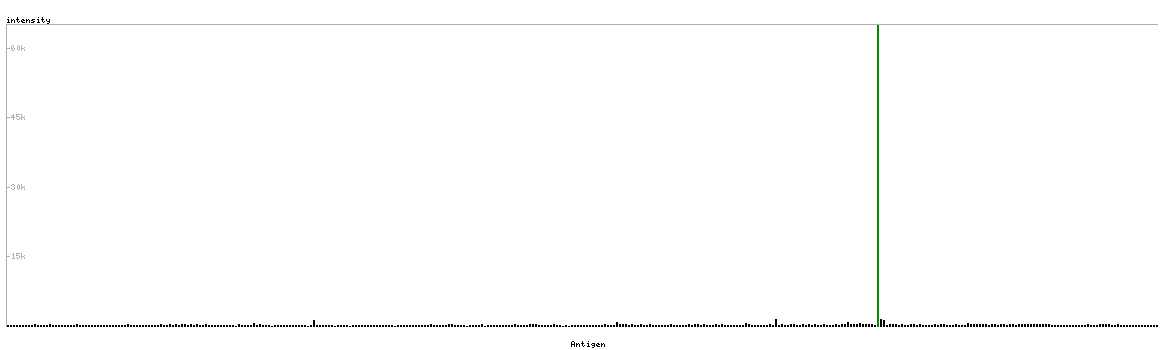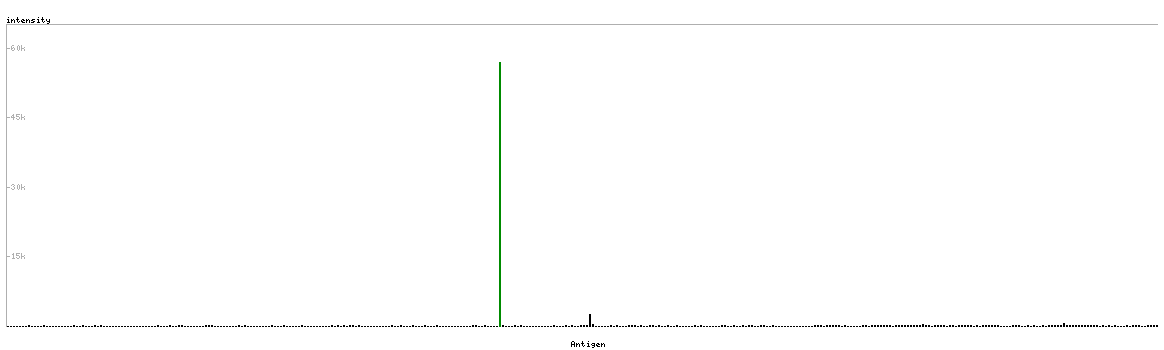 At the top of the view, the position of the antigen (identified by the corresponding HPA identifier) is shown as a green bar. A yellow triangle on the bar indicates a <100% sequence identity to the protein target.