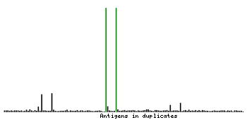 At the top of the view, the position of the antigen (identified by the corresponding HPA identifier) is shown as a green bar. A yellow triangle on the bar indicates a <100% sequence identity to the protein target.