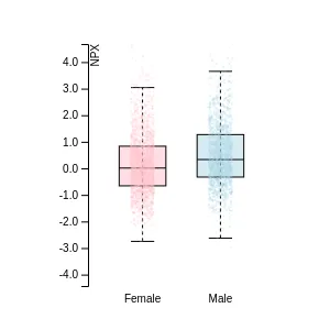 Blood protein levels in 96 healthy adults (aged 50–65) measured at six visits over a two-year period, shown separately for males and females. Relative protein abundances were quantified using the proximity extension assay (PEA) with the Olink Explore HT.