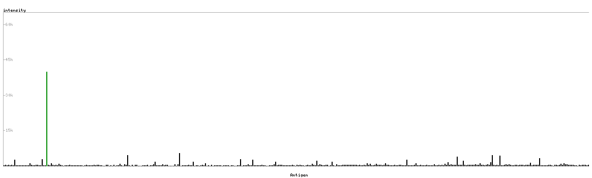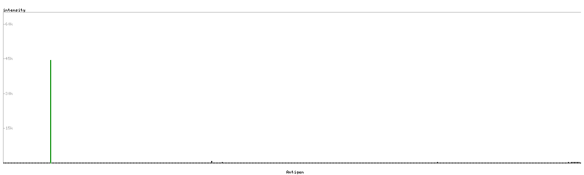 At the top of the view, the position of the antigen (identified by the corresponding HPA identifier) is shown as a green bar. A yellow triangle on the bar indicates a <100% sequence identity to the protein target.