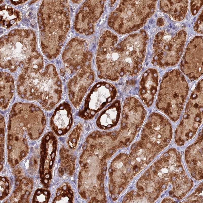 Immunohistochemical staining of human kidney shows strong cytoplasmic positivity in tubular cells.