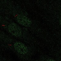 Assay for determining the subcellular location of the encoded protein(s) in human cell lines by indirect immunofluorescence and confocal microscopy. The antibody-based staining is generally carried out in U2OS and up to two additional cell lines, selected based on RNA expression. Representative multi-color images showing the protein of interest in green are displayed below. The images also include markers for the nucleus (blue), microtubules (red) and ER (yellow). All images are clickable for an enlarged view. For an overview of cellular compartments, visit the cell structure dictionary.