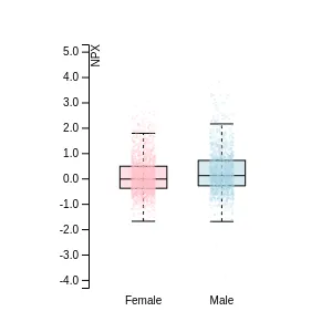 Blood protein levels in 96 healthy adults (aged 50–65) measured at six visits over a two-year period, shown separately for males and females. Relative protein abundances were quantified using the proximity extension assay (PEA) with the Olink Explore HT.