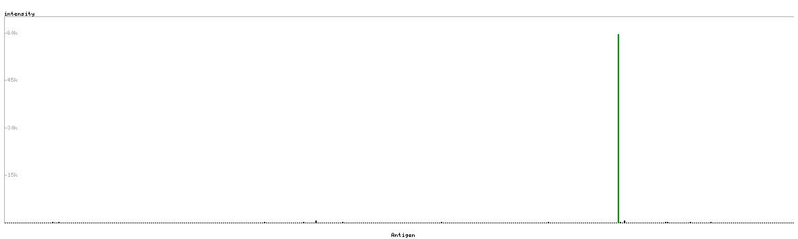 At the top of the view, the position of the antigen (identified by the corresponding HPA identifier) is shown as a green bar. A yellow triangle on the bar indicates a <100% sequence identity to the protein target.