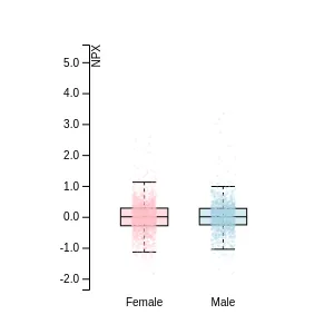 A gene is classified as upregulated in a disease if the average concentration of all samples of that disease is significantly higher (adj P-value<0.005 and NPX difference>=1) than the average concentration of samples of all diseases as measured by PEA . For gender specific diseases the analysis includes only samples corresponding to the same gender from the other diseases.