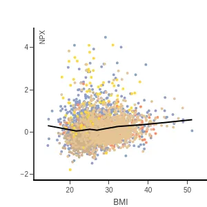 Blood protein levels by age, BMI, and sex, measured using the proximity extension assay (PEA) with the Olink Explore 1536. In the age and sex scatterplots, samples are colored by disease class.