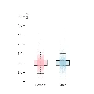 Blood protein levels in 96 healthy adults (aged 50–65) measured at six visits over a two-year period, shown separately for males and females. Relative protein abundances were quantified using the proximity extension assay (PEA) with the Olink Explore HT.