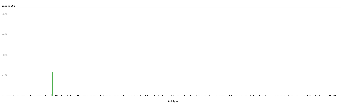At the top of the view, the position of the antigen (identified by the corresponding HPA identifier) is shown as a green bar. A yellow triangle on the bar indicates a <100% sequence identity to the protein target.