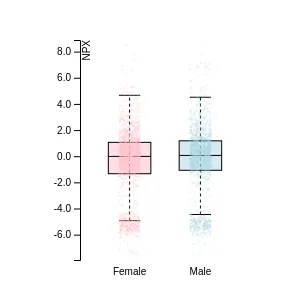 Blood protein levels in 96 healthy adults (aged 50–65) measured at six visits over a two-year period, shown separately for males and females. Relative protein abundances were quantified using the proximity extension assay (PEA) with the Olink Explore HT.