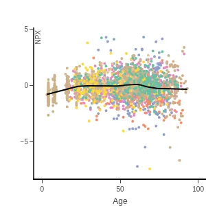 Blood protein levels by age, BMI, and sex, measured using the proximity extension assay (PEA) with the Olink Explore 1536. In the age and sex scatterplots, samples are colored by disease class.