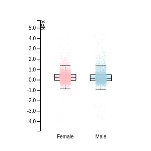Blood protein levels in 96 healthy adults (aged 50–65) measured at six visits over a two-year period, shown separately for males and females. Relative protein abundances were quantified using the proximity extension assay (PEA) with the Olink Explore HT.