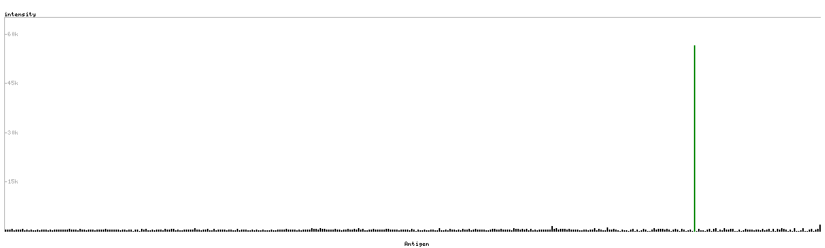 At the top of the view, the position of the antigen (identified by the corresponding HPA identifier) is shown as a green bar. A yellow triangle on the bar indicates a <100% sequence identity to the protein target.