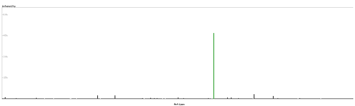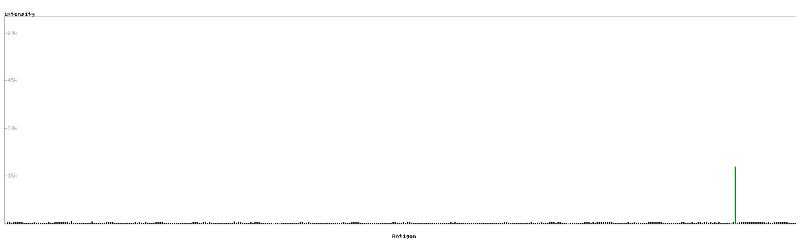 At the top of the view, the position of the antigen (identified by the corresponding HPA identifier) is shown as a green bar. A yellow triangle on the bar indicates a <100% sequence identity to the protein target.