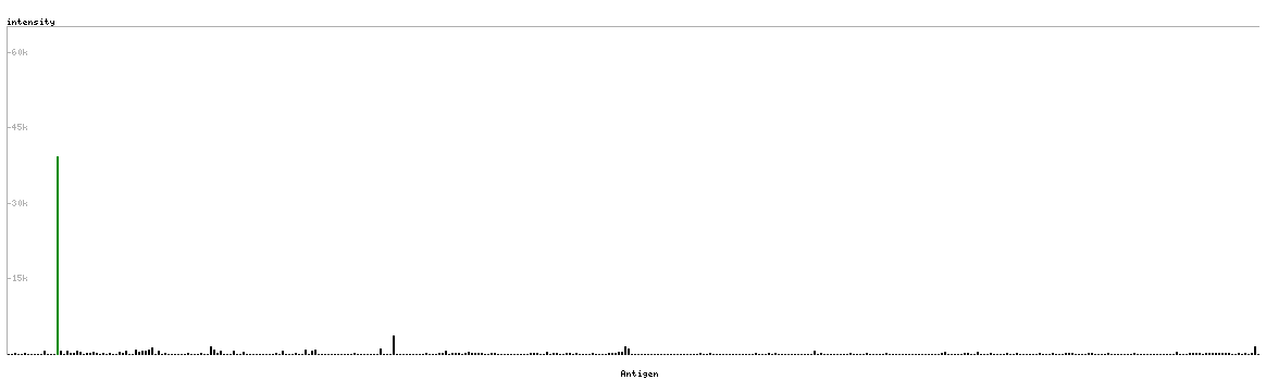 At the top of the view, the position of the antigen (identified by the corresponding HPA identifier) is shown as a green bar. A yellow triangle on the bar indicates a <100% sequence identity to the protein target.