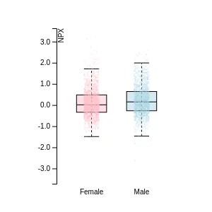 Blood protein levels in 96 healthy adults (aged 50–65) measured at six visits over a two-year period, shown separately for males and females. Relative protein abundances were quantified using the proximity extension assay (PEA) with the Olink Explore HT.