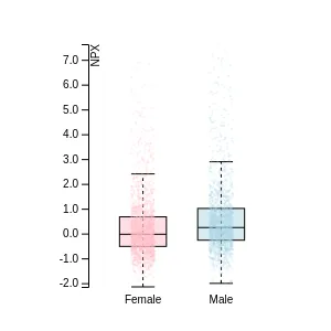 Blood protein levels in 96 healthy adults (aged 50–65) measured at six visits over a two-year period, shown separately for males and females. Relative protein abundances were quantified using the proximity extension assay (PEA) with the Olink Explore HT.