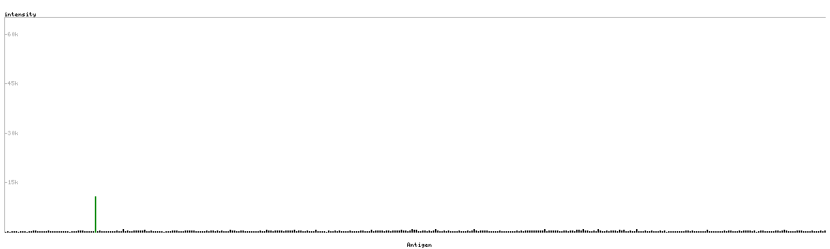 At the top of the view, the position of the antigen (identified by the corresponding HPA identifier) is shown as a green bar. A yellow triangle on the bar indicates a <100% sequence identity to the protein target.