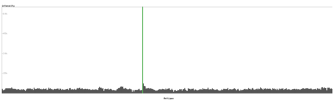 At the top of the view, the position of the antigen (identified by the corresponding HPA identifier) is shown as a green bar. A yellow triangle on the bar indicates a <100% sequence identity to the protein target.