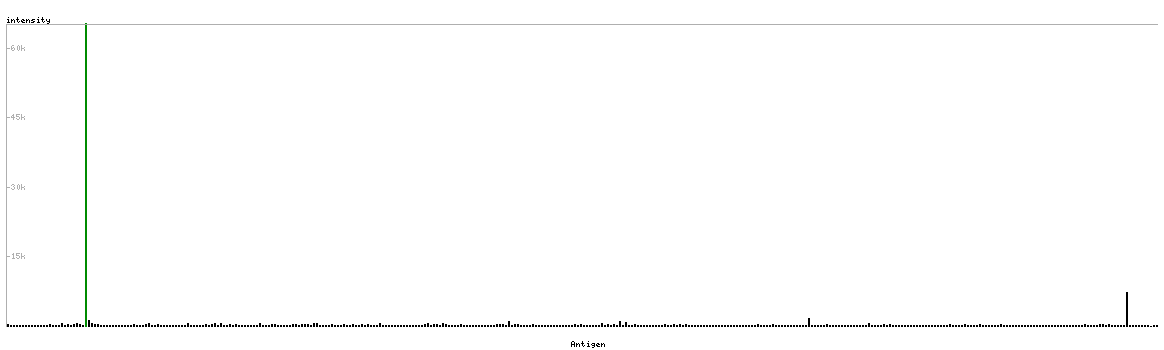 At the top of the view, the position of the antigen (identified by the corresponding HPA identifier) is shown as a green bar. A yellow triangle on the bar indicates a <100% sequence identity to the protein target.
