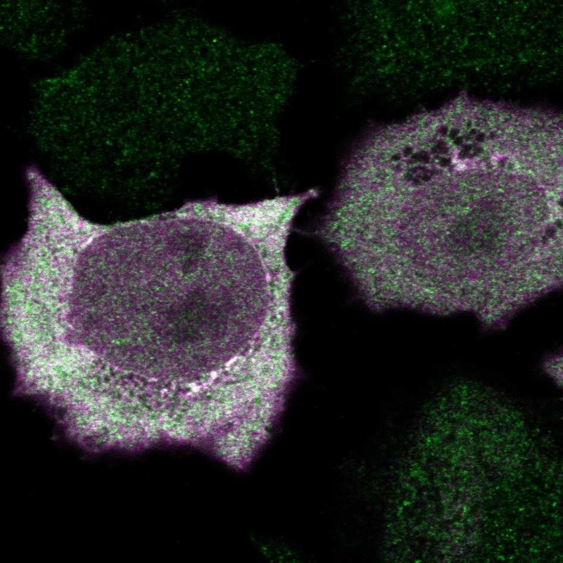 Immunofluorescent staining of transgenic HeLa cells show antibody staining in endoplasmic reticulum & the Golgi apparatus and GFP expression in endoplasmic reticulum & the Golgi apparatus.